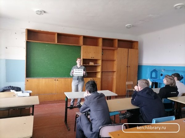 Сотрудник библиотеки-филиала № 3 им. Н. Островского провела для старшеклассников МБОУ г. Керчи РК «Школа № 13 имени Героя Советского Союза А.Д. Шумского» диспут «Мы против насилия и экстремизма».
