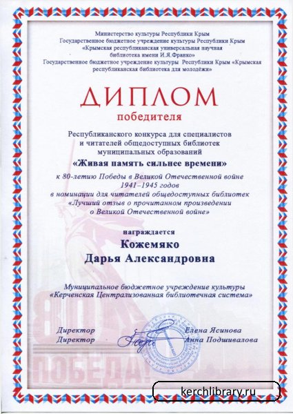 Дипломом победителя награждается Кожемяко Дарья Александровна (библиотека-филиал № 1 им. О. Кошевого);
