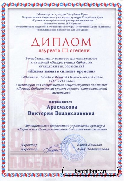 Дипломом Лауреата III степени награждается Ардемасова Виктория Владиславовна (библиотека-филиал №3 им. Н. Островского);