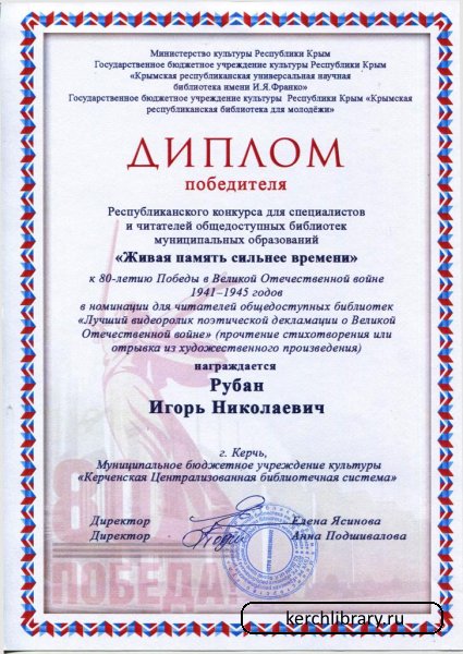 Дипломом победителя награждается Рубан Игорь Николаевич (ЦГБ им. В. Г. Белинского);
