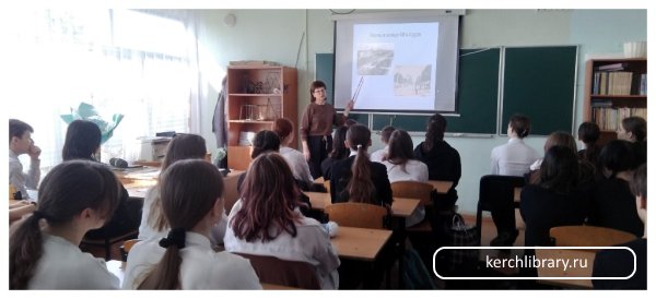 В преддверии 82-й годовщины освобождения города-героя Керчи от немецко-фашистских захватчиков, для старшеклассников МБОУ «Школа №25» заведующая библиотекой-филиалом № 4 им. М. Горького Кравчина О. А. провела историко-краеведческий реквием «Лишь память сердца не дает забыть».